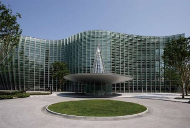 「国立新美術館」は故・黒川紀章の設計であり、外観は前面を覆うガラスカーテンウォールが、波のようにうねる美しい曲線を描いています。このガラスカーテンウォール越しに、青山公園など周辺の緑地にとけこむように植栽された庭園の眺めを楽しむことができます。