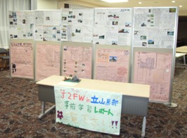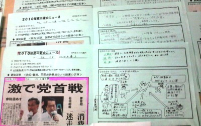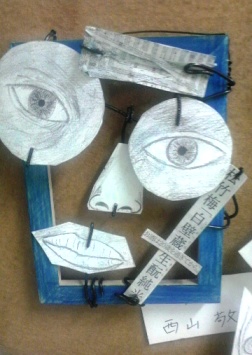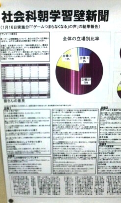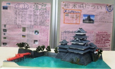 | 中2のフィールドワークの作品「松本城のミニチュア」です | 社会科朝学習の壁新聞 毎週土曜朝、生徒は新聞記事を読み、単文のコメントを書きます | それらのコメントを毎週、社会科教員が集約して、壁新聞にします |