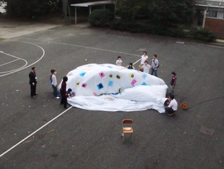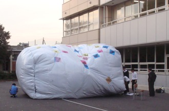 一人四つ程の惑星をつくり終え、ついに巨大バルーンを前庭にて膨らまし始めました。参加児童は不安と期待に胸に、うねうねと徐々に膨らむバルーンを見守っていました。大きく膨らむにつれて穴が開いている部分が多数発見されましたが、皆で協力しながら穴をテープでふさぐ姿が見られました。