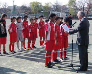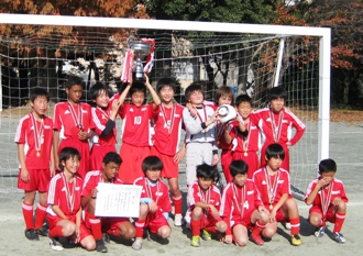 | 日本サッカー協会公認1級審判員の本校卒業生が決勝戦の主審をつとめました | 野火止小の皆さん優勝おめでとうございます | 優勝カップを頭上に掲げて記念撮影 |