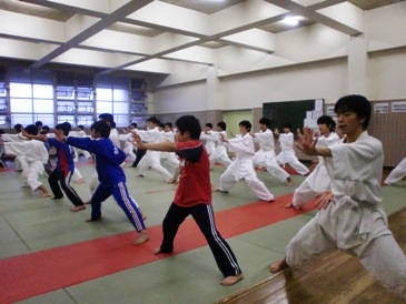 演武内容は私たちが行っているものと同じものが多いのですが、そこはやはり大学生。女性もいるし、身体も大きいし、稽古の量も質も違います。一つ一つの技や型、組手・組棒の迫力には圧倒されてしまいました。さらにふだんでは見ることのできない演武もあり、いつかはできるようになりたいと思った人も多いのではないでしょうか。これを糧にまた稽古に励んでほしいものです。