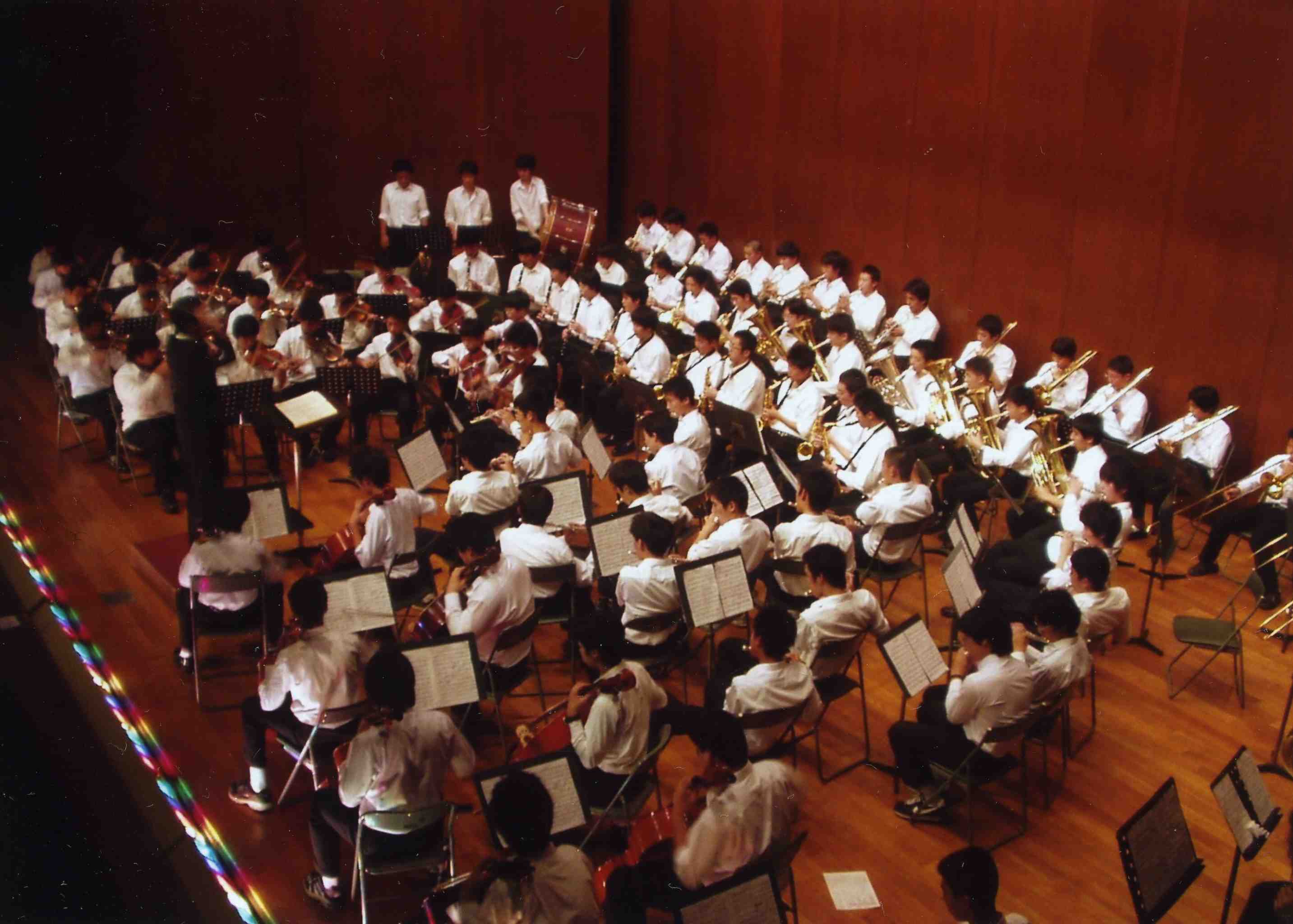 本校では音楽授業の一環として中学生全員がオーケストラの演奏を行っています。中1からパートごとに専門の講師に毎週習い、中2と中3の明法祭で発表します。当日の講堂は保護者などの熱気で一杯です。