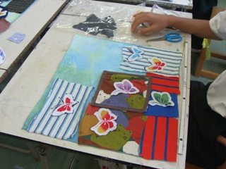 今年は美術作品をコラボレーションさせて、入り口を飾ります。藍染めのフラッグや古着を活用したパッチワークのフラッグが、校門から校舎エントランス近くまでの「ゲート」にずらりと飾られます。中学2年生や高校1年生が美術の授業のなかで、そして明法祭実行委員会のアーチ課の生徒や美術同好会の生徒が自主的に作成しました。その枚数はなんと450枚!