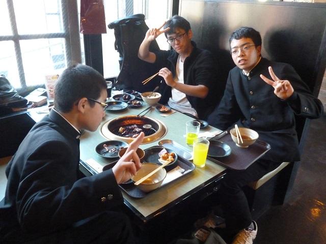 当日の午前中は平成28年最後の稽古。目的の半分はお腹を減らすためかもしれません。稽古後幹部交代式を行い、新主将高2K君のもと一路焼き肉屋さんへ! 毎年の事ですが食べ放題メニューは豊富です。カルビだげで数種類、ロース・ハラミは当たり前!豚トロ・鶏肉・砂肝...牛すじカレーにうどん、海鮮丼...アイスにケーキにプリン!さらに飲み放題。制限時間は90分なのですが、今年は一台のコンロの火力が弱く、数名が途中でテーブルを替わるハプニングもあり、全員15分プラスとなりました。ラッキー?