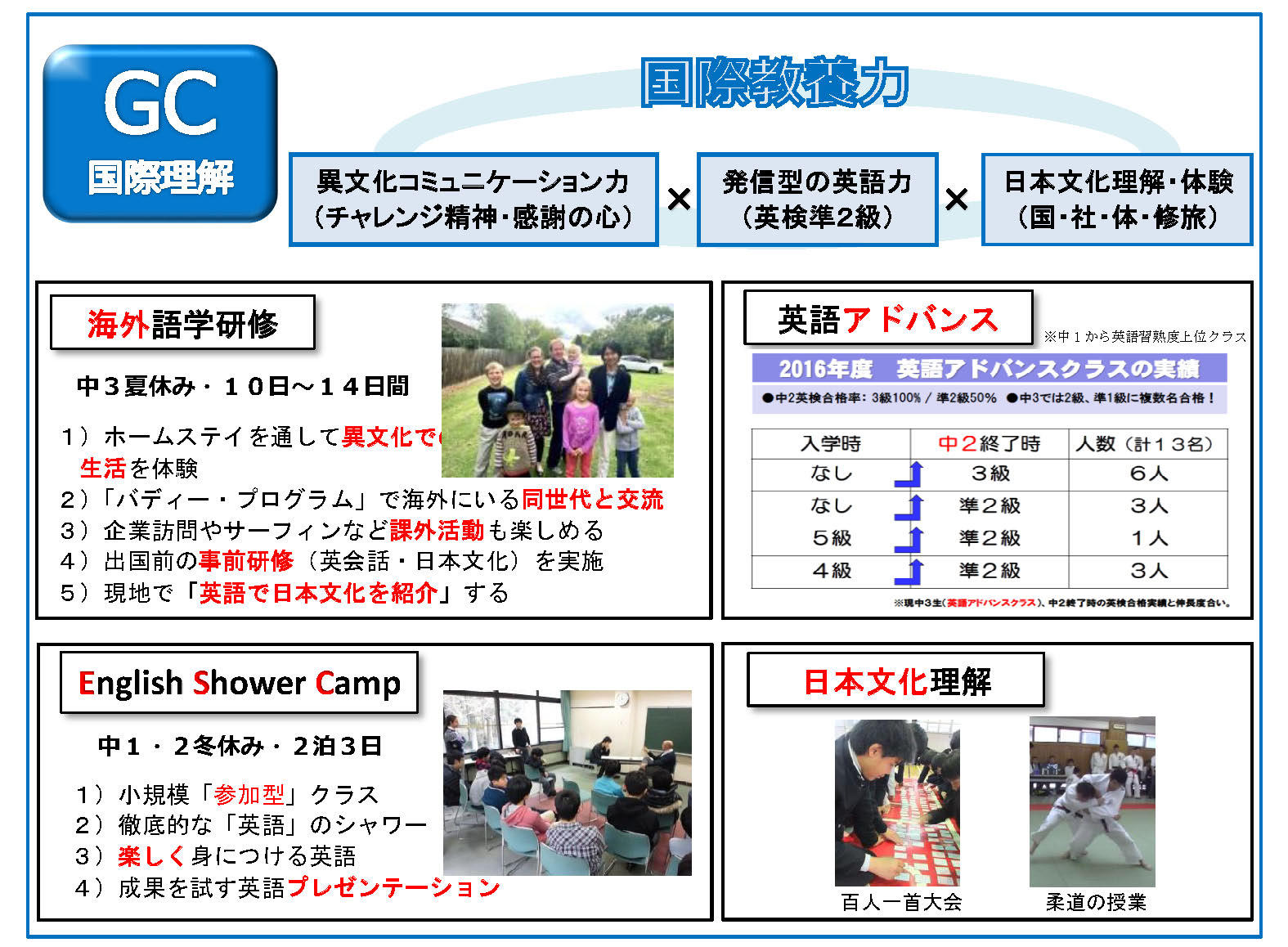 このような行事や英語アドバンス授業・ECW英会話授業などを通じて、異文化コミュニケーション力や発信型の英語力を育て、日本文化の理解をさせて、高校での国際教育プログラムGSP(グローバル・スタディーズ・プログラム)での充実した活動につなげていきます。