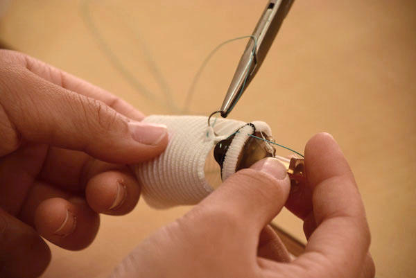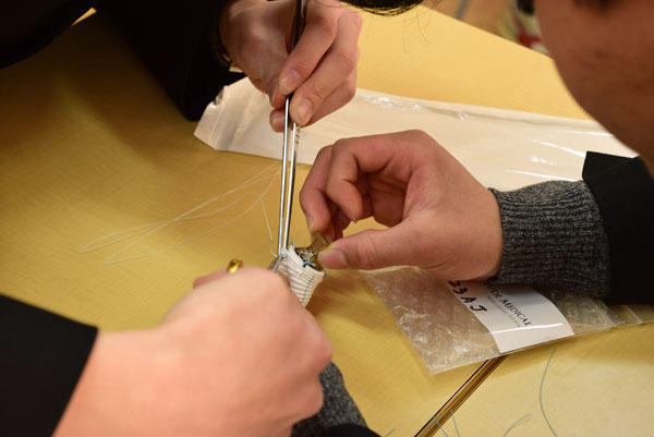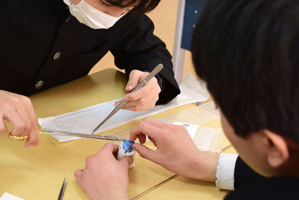 南淵先生の説明ののち、生徒は直径2cmほどの人工血管に人工心臓弁を手術針を用いて縫い付け、南淵先生にレビュー・アドバイスを頂きます。