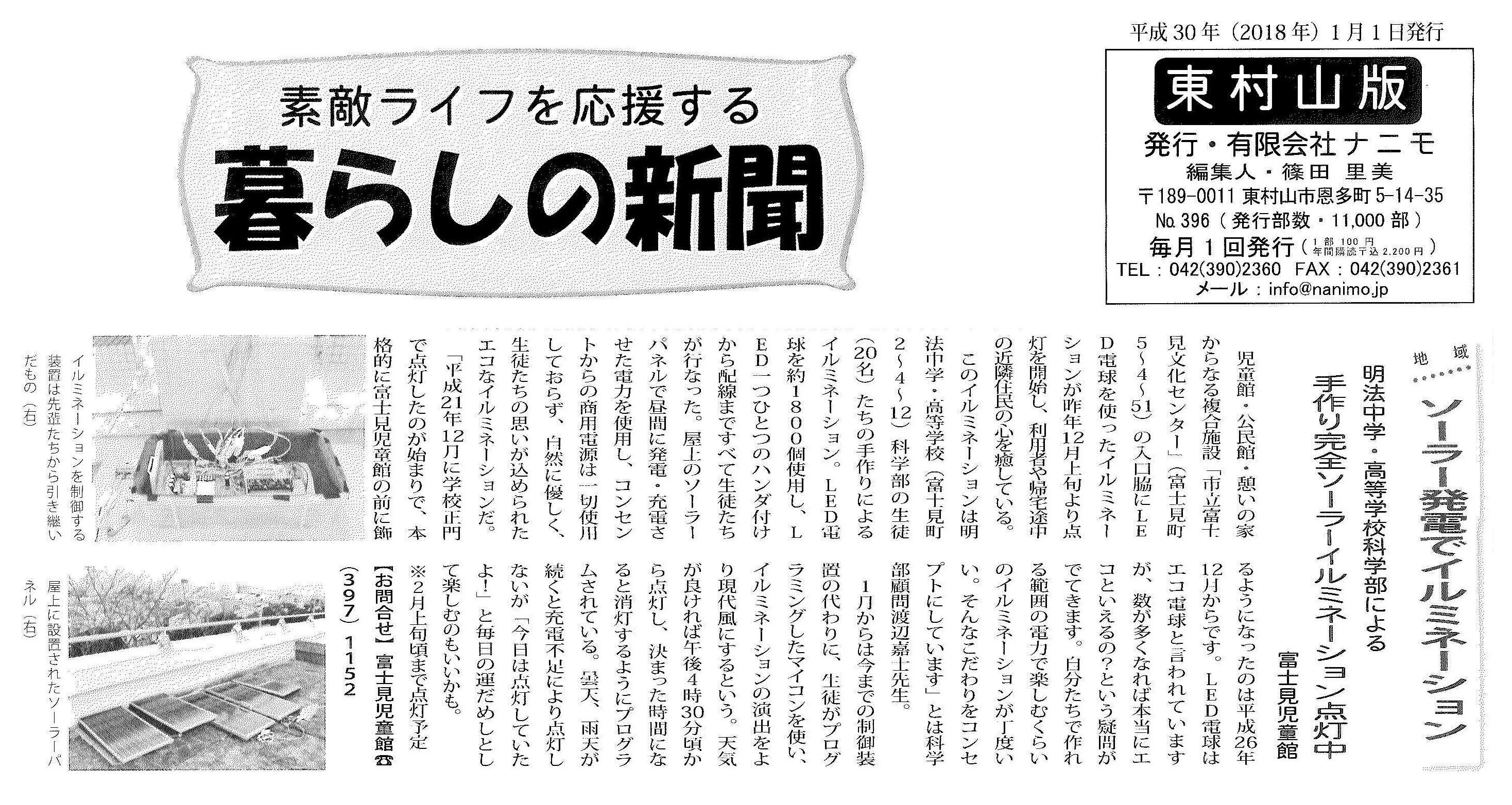 科学部では、毎年地元の富士見文化センター(富士見児童館)前に手作りの完全ソーラー発電によるイルミネーションを飾っています。この活動が1月1日発行(1月10日折り込み)のミニコミ紙に掲載されました。 このイルミネーションは、歴代科学部の生徒が活動の一環として手作りでLEDを一つ一つはんだ付けして作っているもので、LED1800個使用しています。 生徒たちの努力の結晶ですので、お近くをお通りの際はぜひご覧下さい。