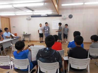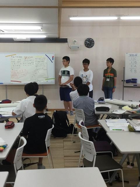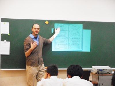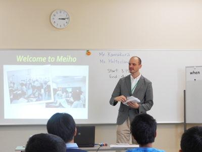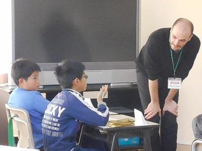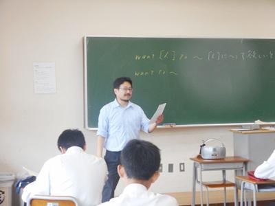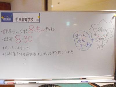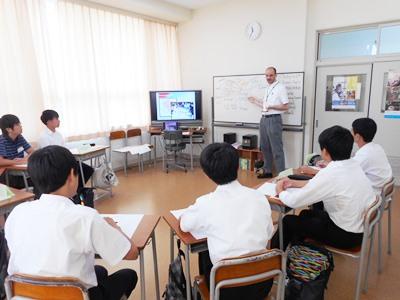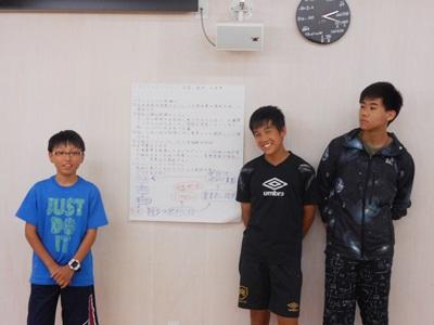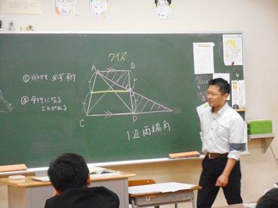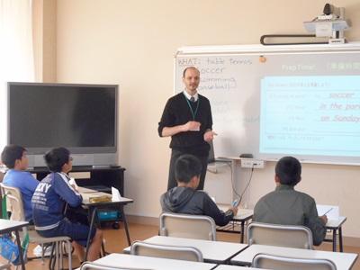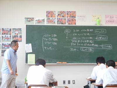 合宿中は厳しい訓練が多いが、生徒には楽しかった思い出として残る。これからも楽しませて鍛えていこう。スナップの隣には、中1の一人ひとりの自筆の目標が掲示してある。「勉強、部活などすべてにおいてチャレンジする」というものが圧倒的多数。「ひたすら努力する」、「友達をたくさん作りたい」など、個性豊かな目標ばかりで、心からその成就を願う。ところが、「14番以内に入る」というのがあった。ベストテンなど、区切りの良い目標ではない。なぜかと考えた末の結論は、このクラスは28人、したがって半分の14以前という意味であろうと想像した。何とも控え目でかわいらしい目標ではないか。かわいさに釣られて授業中の教室に入った。英語の授業であった。ミスターブラウンを、ミスターブローンと発声する生徒がおり、その生徒に恥をかかせず、全員の集中を切らさず、苦労して修正して、先に進む先生の指導に頭が下がった。本日はここでチャイムである。