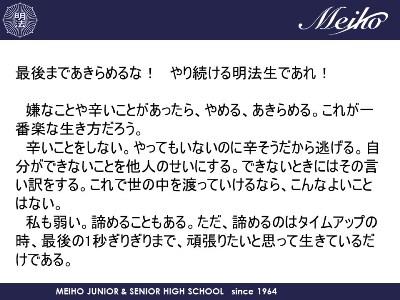 この3条件を体現すること、これが"明法スピリッツ"だと信じている。 (文責:教頭 早乙女勤)
