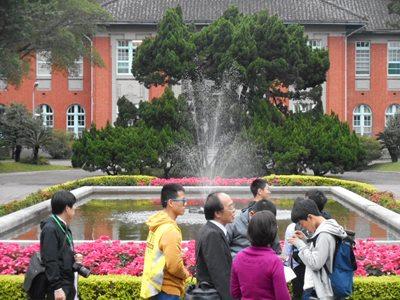 人工芝のテニスコートの向かいは理科棟。雑木林に囲まれた理科棟周りの池では、鋭く方向を変えたり走ったりすることで、やっと気づく小魚がいます。昼休みには米粒を餌に魚釣りを楽しむ生徒が現れることがあります。まさに生徒の憩いの場です。また池には、二羽のカルガモが、春から秋までこの池や50mプールで休んでいます。排泄物による汚れが気になりますが、カルガモの腰をフリフリの行進を見るのも楽しいものです。