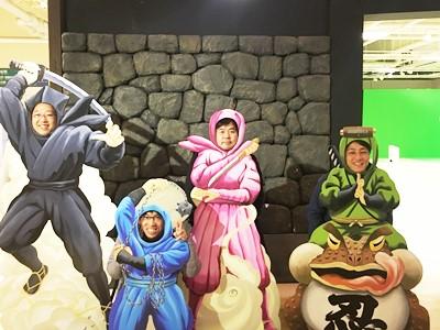 中1オリエンテーション合宿のスナップ300枚が掲示してある。学習中の様子、雪の上での遊び、食
