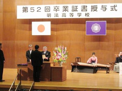 卒業証書授与および式辞のときに、ステージでお琴と尺八、笛での生BGMが演奏されました。