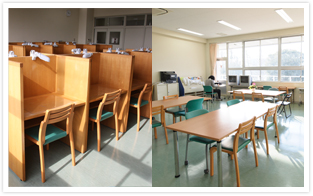 - 本校舎2階には5つの学習室に分かれた「学習道場」があります。そのなかには、独立したブース形式の自習机がおかれた「無言自習室」や、平机のおかれたオープンな雰囲気の部屋があり、生徒の「一人で集中して学習したい」や「複数の友人で教えあったり、先生からの指導を受けたい」の希望に対応しています。高校2年生・3年生は最大19:30まで利用が可能ですので、部活動終了後も学習が可能です。